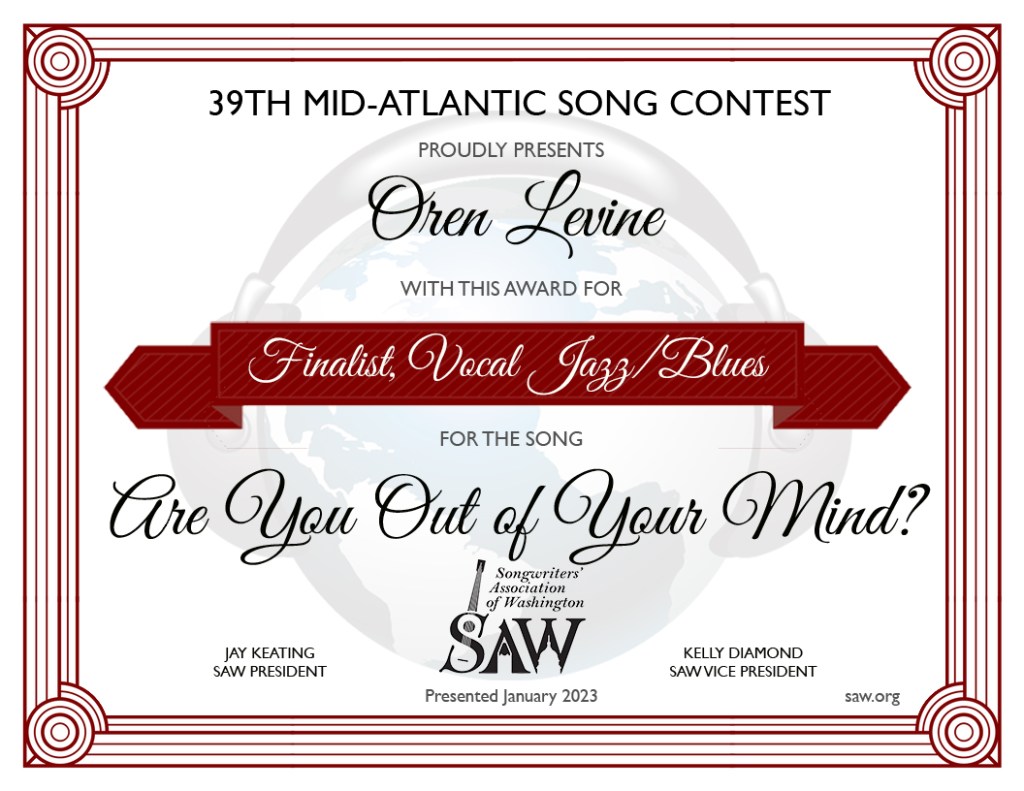 My song “Are You Out Of Your Mind” was a finalist (Vocal Jazz/Blues) in the 2022 Mid-Atlantic Song Contest.